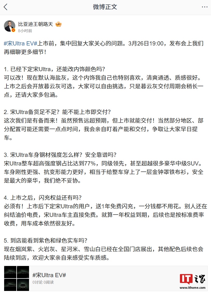 IT之家 3 月 24 日消息,比亚迪王朝网销售事业部总经理路天今日发文,集中回复了关于宋 Ultra EV 上市的相关问题。