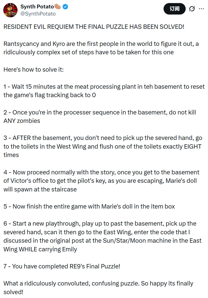 内容创作者SynthPotato(此前曾在X平台详细解析过该彩蛋的发现过程)在更新动态中确认,玩家Rantsycancy与Kyro成为全球首批完成破解谜题所需复杂步骤序列的玩家。这个谜题最初引发关注是因该创作者发现了一系列与断手道具、隐藏血液分析仪信息以及关联日月星辰的奇异天体密码相关的神秘线索。调查最终指引玩家来到罗兹山疗养院东翼的某台机器,输入特定序列会触发诡异笑声,但直至此刻前始终未能完全解开"终极谜题"。