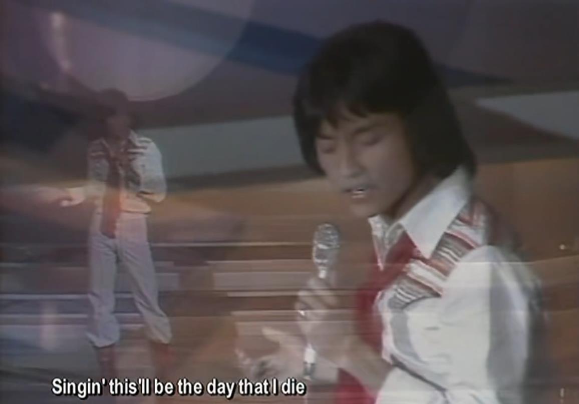 这简直是70年代香港流行乐坛的生动写照——那时的香港,说到流行乐,是完全西化的,从堪称cosplay的服装到全套的英文歌,而华语音乐还在不安的胎动期。最后,小歌手Leslie Cheung在丽的电视亚洲歌唱大赛香港区拿到第二名,也靠着电视选秀这一经典造星模式收获了他的第一批粉丝。其中就包括给他献花的7岁小朋友莫文蔚。顺便说一句,这对辈分上算叔叔和侄女的歌手,在多年后尔冬升导演的文艺三级片《色情男女》中最终还是演上了情侣。