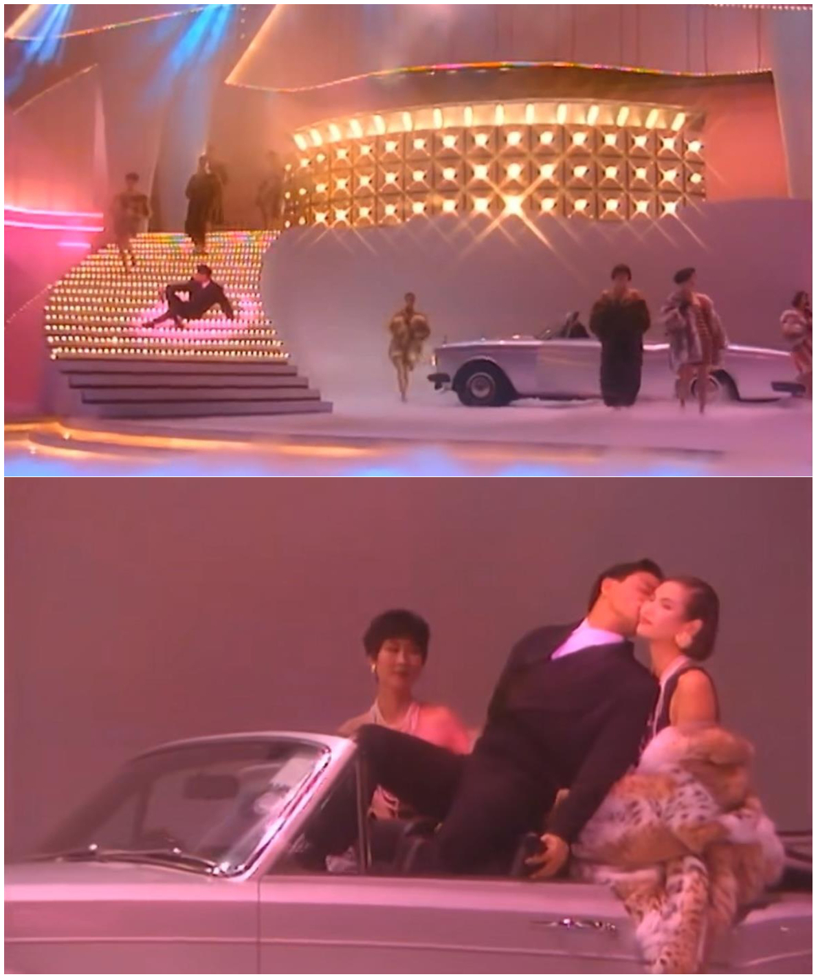 第一首歌《滴汗》演绎的“花花公子”,性感从容,毫无包袱与造作地释放男性魅力,伴随着歌词中的“Are You Ready For Love”如同羽毛拂过丝绒的声线,他回眸一笑反身走上坐满貂裘佳丽的敞篷跑车,车从舞台缓缓开出,他与她们激情拥吻,这个放在今天依然无比大胆和惊艳的舞台表演,只有香艳而没有下流,朦胧的光影中仿佛飘满了80年代少女的梦。