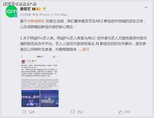 据悉,此次争议的导火索源于龚宇在相关活动中的发言,他不仅宣布爱奇艺将依托自研的纳逗Pro平台构建AI艺人库,声称已有超百位深度合作艺人同意入驻,还提出“实拍确实永远存在,但完全没有科技含量的纯物理制作作品,未来可能成为非遗”的观点,这番表述点燃网友不满情绪,不少网友表示说“拒绝看AI演戏”“技术不能取代艺术温度”。